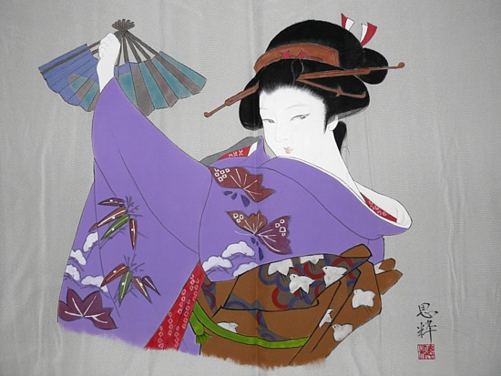 изображает гейшу в сиреневом кимоно, танцующую с веером.