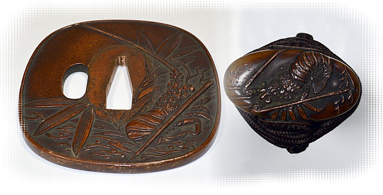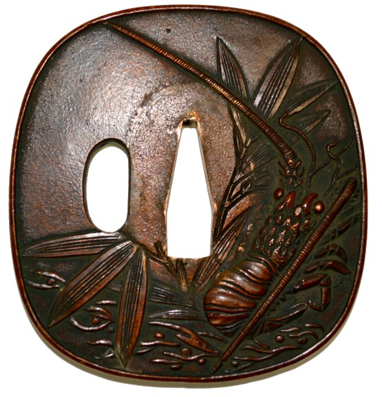 Цуба и фучигашира с изображением лобстера - родового герба самурайского рода.