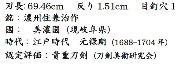 - Длина клинка нагаса: 69.46см (二尺三寸 2.3 Shaku)